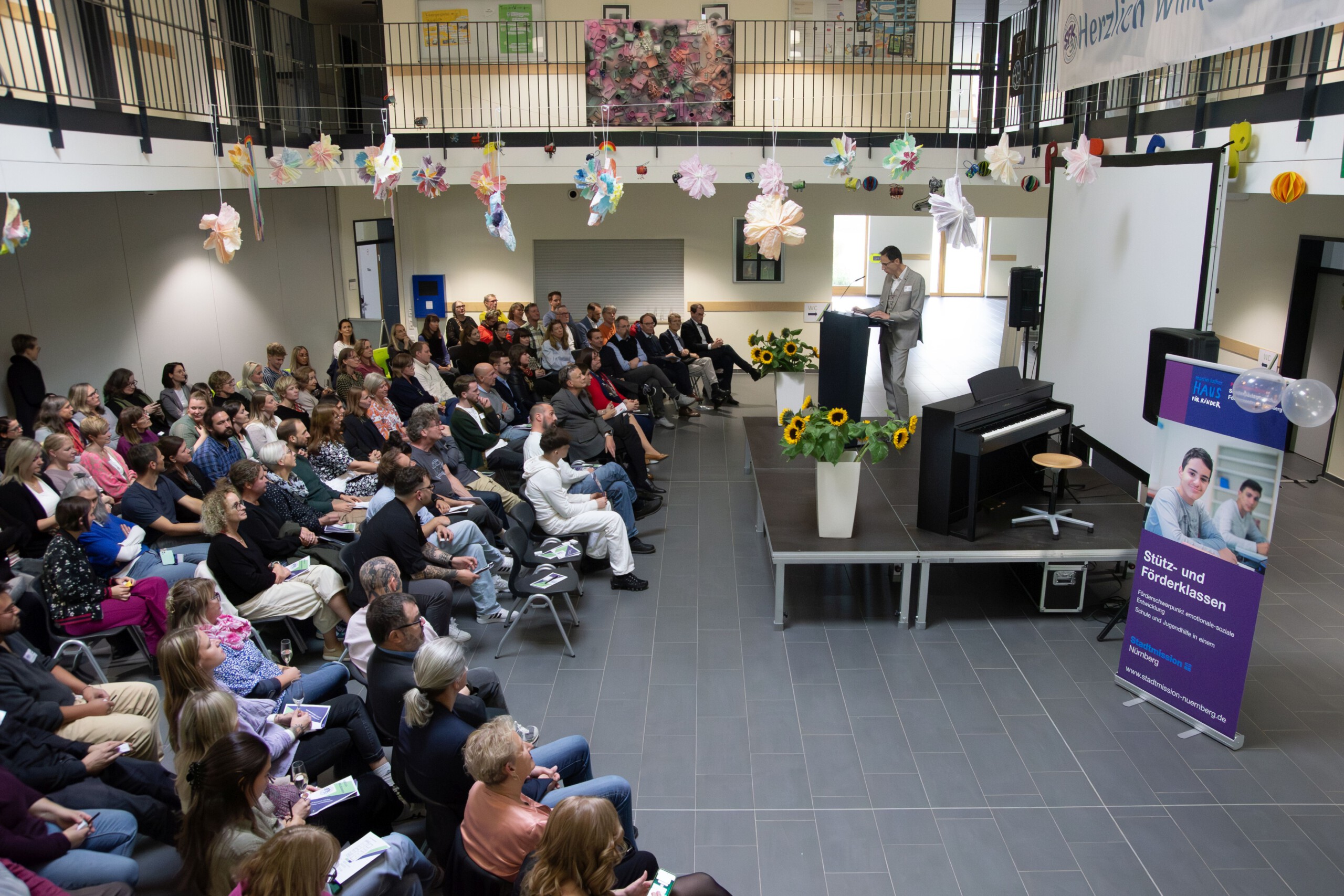 Nürnbergs Schulreferentin Cornelia Trinkl würdigte die Arbeit der Stütz- und Förderklassen in einem Grußwort und überbrachte in Vertretung von Nürnbergs Oberbürgermeister Marcus König die Glückwünsche der Stadt. Stefanie Fuchs, Regierungsschuldirektorin bei der Regierung von Mittelfranken, lobte ebenfalls die erfolgreiche Verzahnung von Schule und Jugendhilfe. Bevor sich die Gäste in den Räumen der Stütz- und Förderklassen umschauen konnten, gab Prof. Dr. Thomas Müller vom Lehrstuhl Pädagogik bei Verhaltensstörungen an der Universität Würzburg noch einen inspirierenden, fachlichen Impuls.