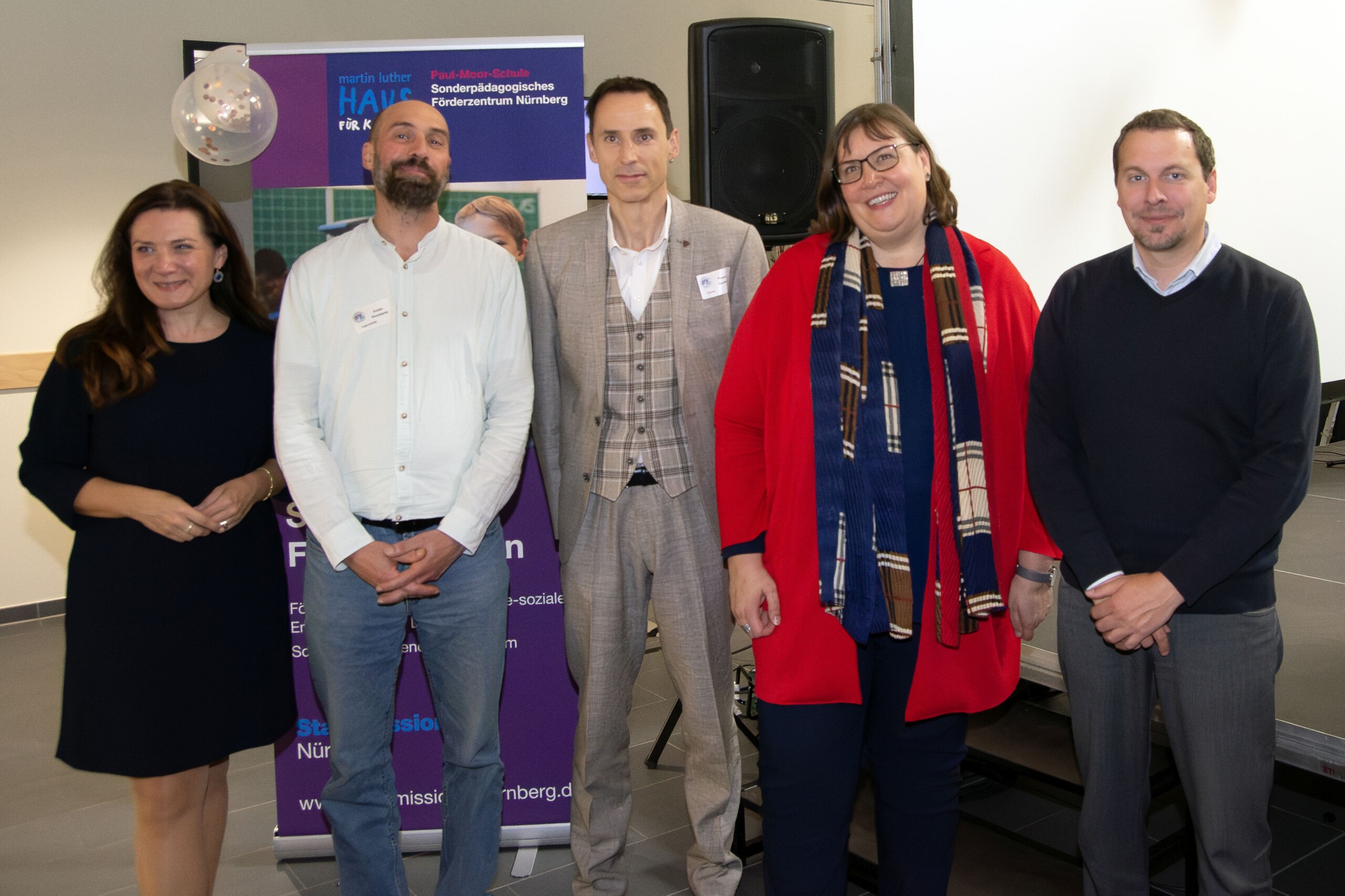 30 Jahre Stütz- und Förderklassen: Dieses Jubiläum feierten Nürnbergs Schulreferentin Cornelia Trinkl, Guido Previderio (Einrichtungsleiter von Seiten der Stadtmission), Thomas Buchner (Schulleiter Paul-Moor-Schule), Regierungsschuldirektorin Stefanie Fuchs sowie Kai Stähler, Vorstandsvorsitzender der Stadtmission Nürnberg (v. li.).