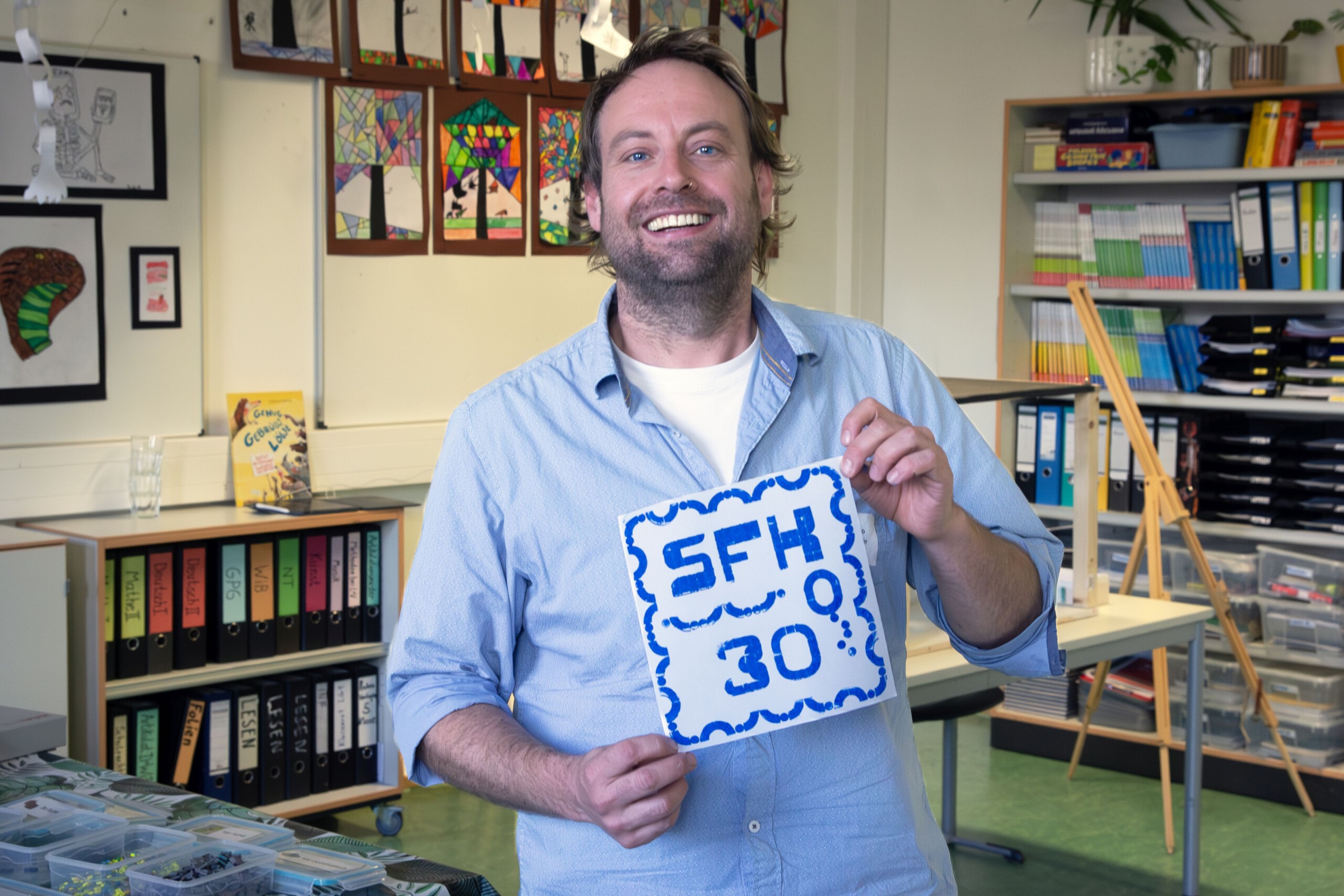 Klassenleiter Mario Harder macht seinen Schülerinnen und Schülern Kreativangebote – hier zum Beispiel ein Druck zum 30-jährigen Jubiläum.